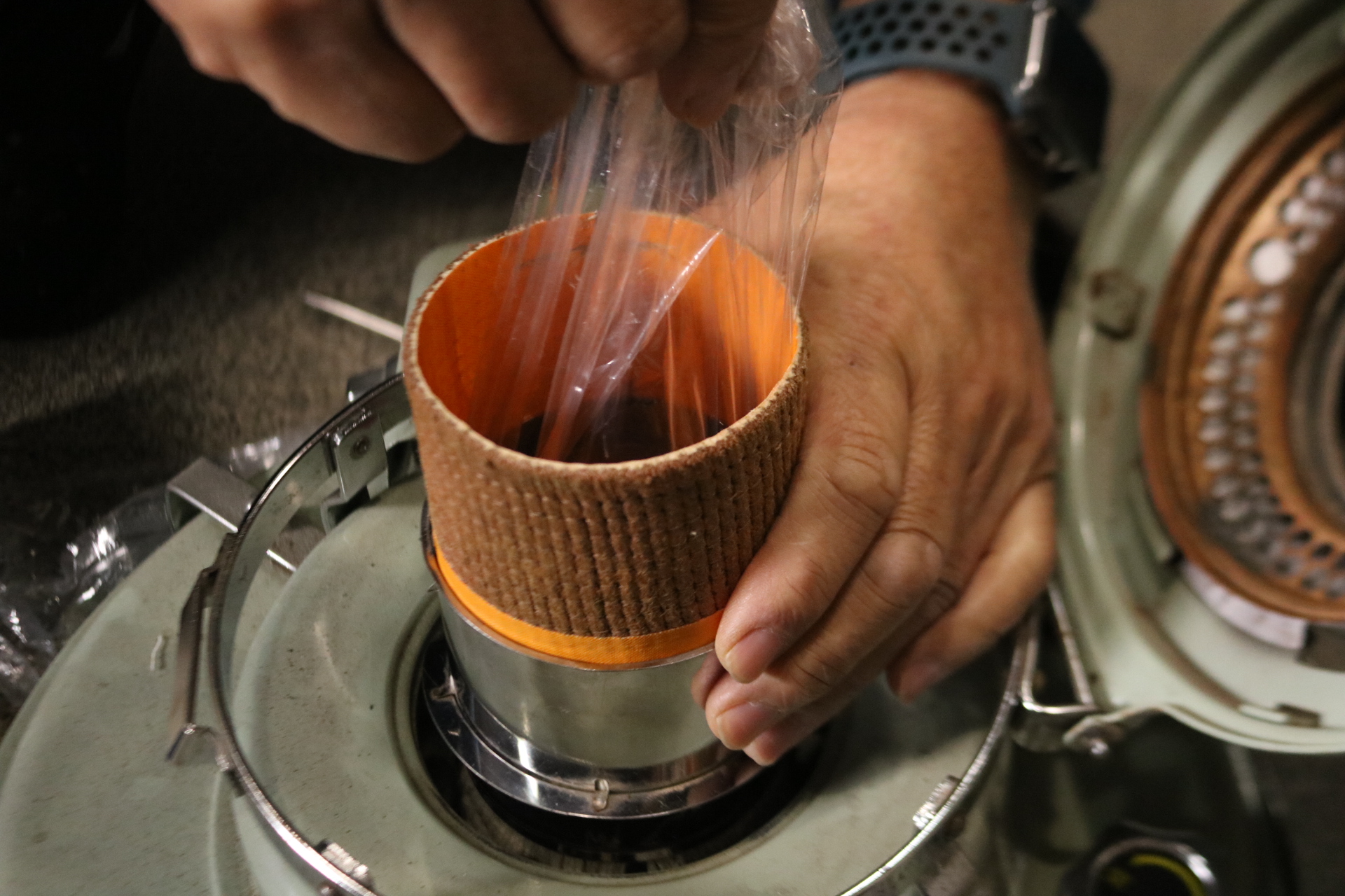 替え芯を包装しているビニール袋をストーブ内煙筒にかぶせて替え芯を取付すると装着しやすいです。